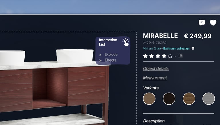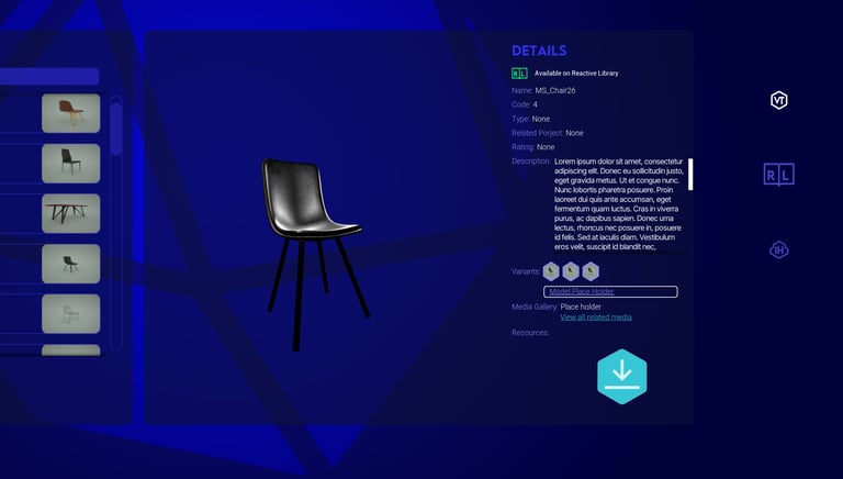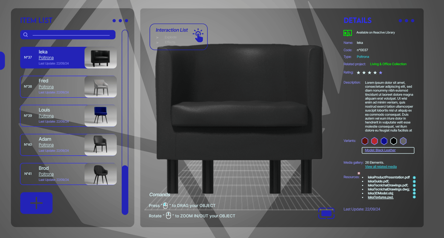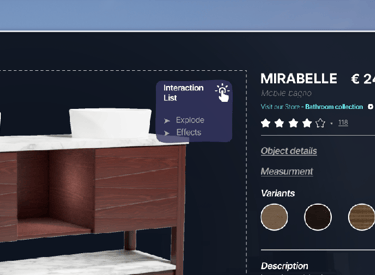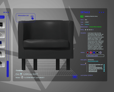 Virtual Twins are indexed in a dedicated inventory, where you can modify and manage multimedia resources and specifications. They are then allocated to Immersive Hub projects and used in virtual showrooms to showcase them to the public.
