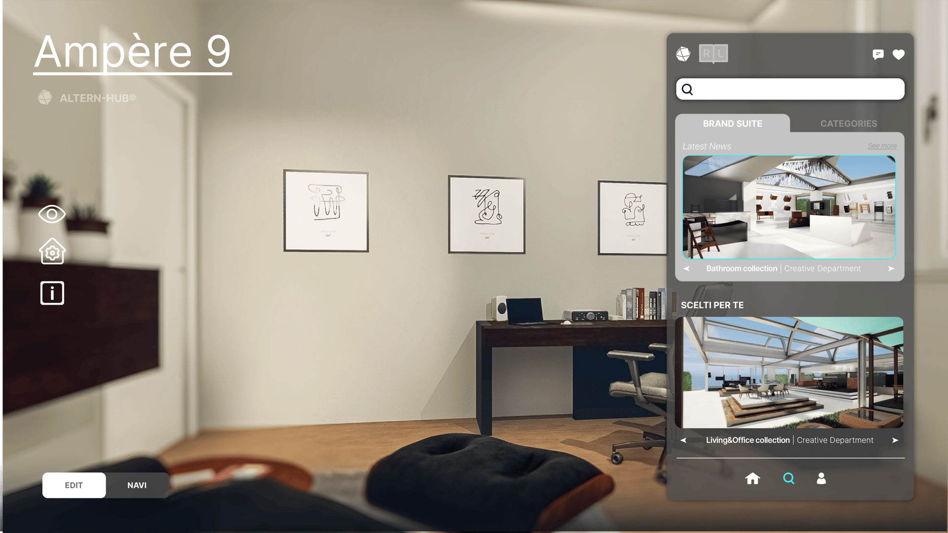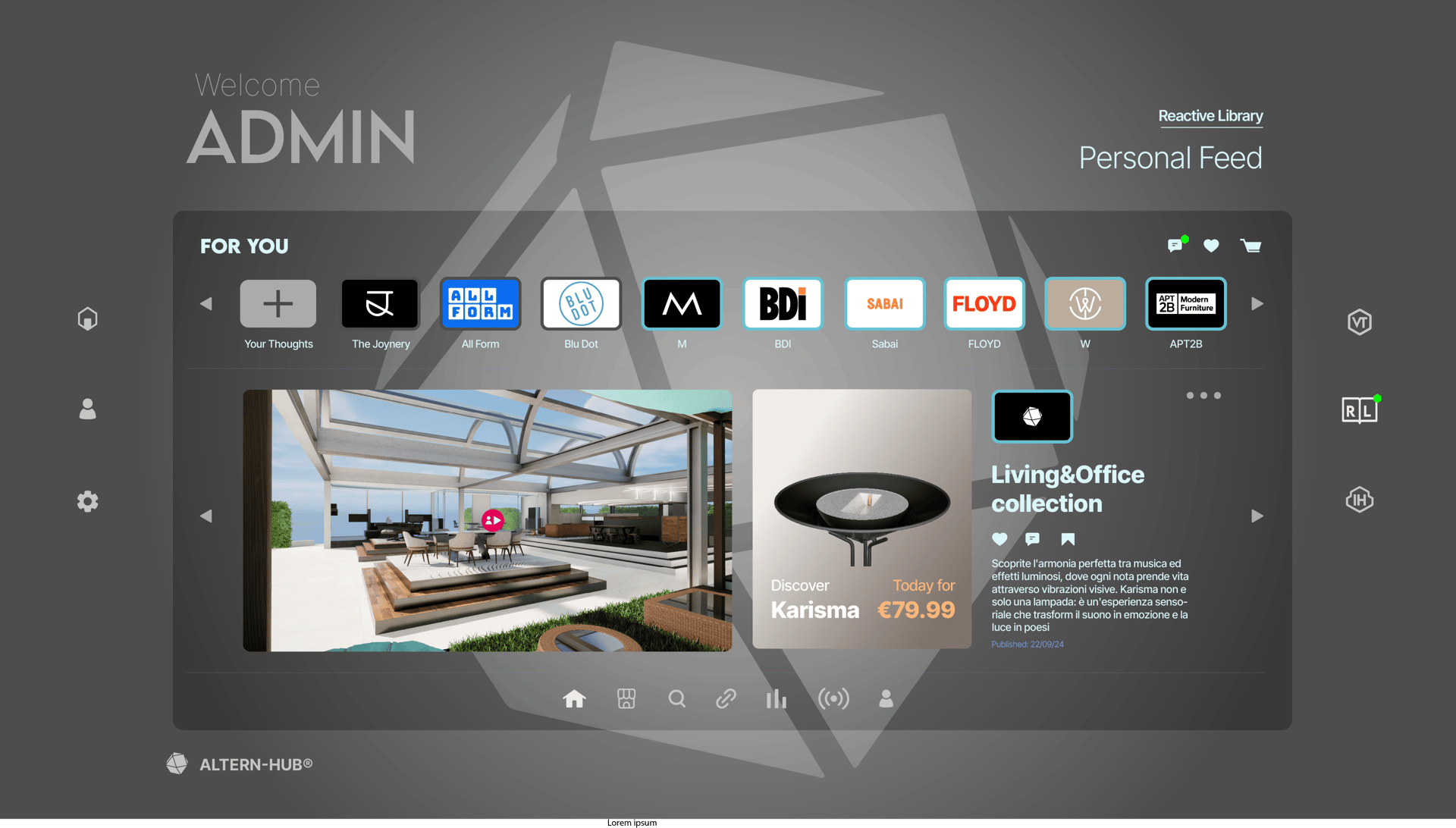 La Reactive Library è una piattaforma all’interno di AlternHub che permette ai produttori di arredo e ai professionisti dell’architettura di scambiarsi risorse multimediali come modelli 3D, texture e planimetrie. Con un profilo personalizzato, ogni utente può gestire e monitorare le proprie performance, migliorando la visibilità dei propri progetti e costruendo nuove relazioni commerciali.