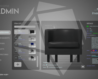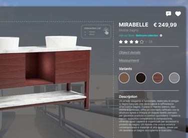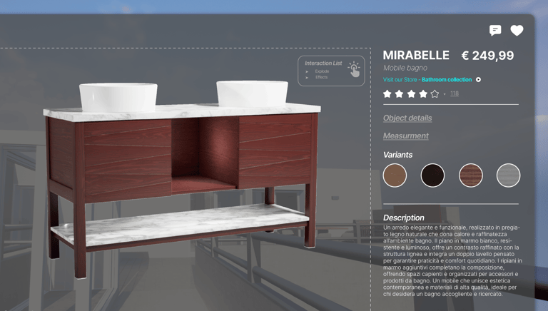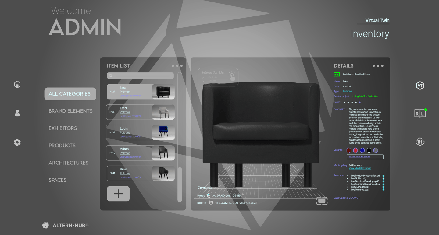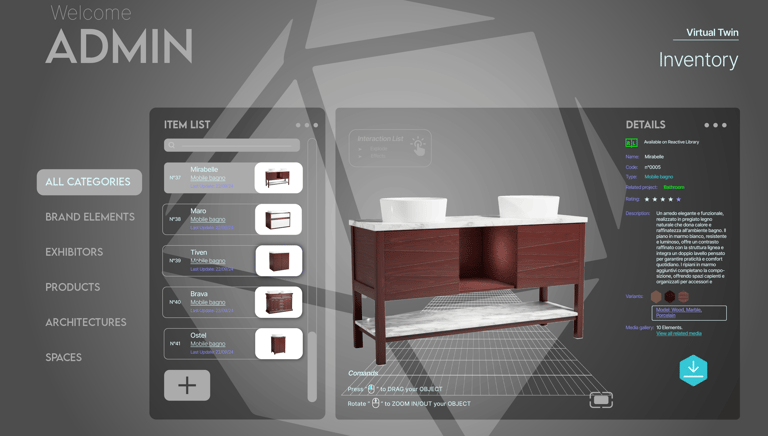 Virtual Twin vengono indicizzati in un inventario dedicato, li potrai modificare e gestirne risorse multimediali originali e specifiche disponibili. Successivamente vengono allocati nei progetti Immersive Hub e utilizzati in showroom virtuali per raccontarsi al pubblico.
